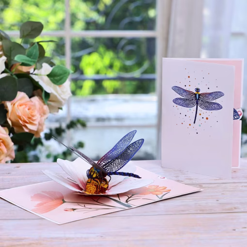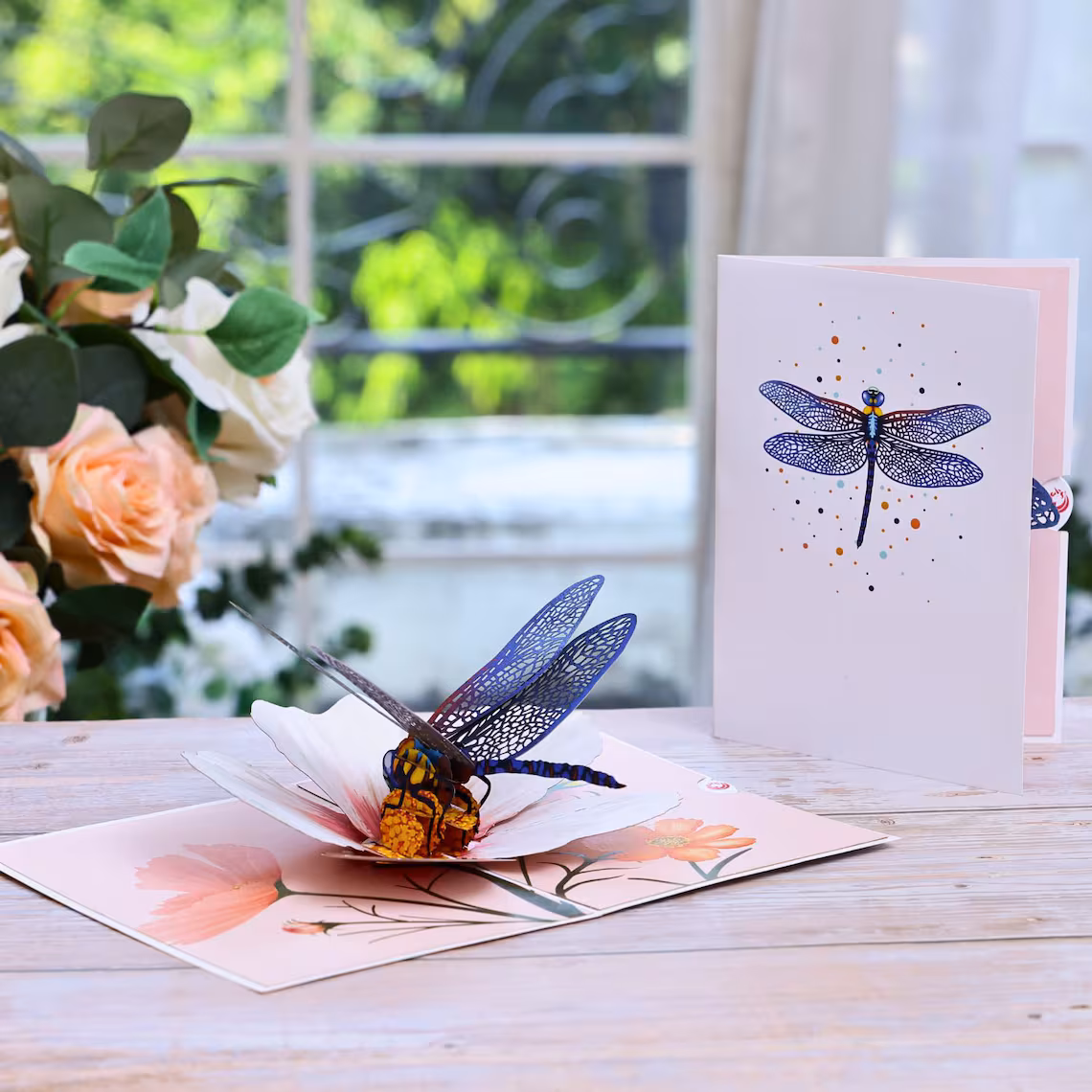 🌿 READY TO SEND: pack with a white envelope for sending and a blank notecard for personal touch. This Dragonfly pop up card is ready to be sent right away whenever you are ready.
